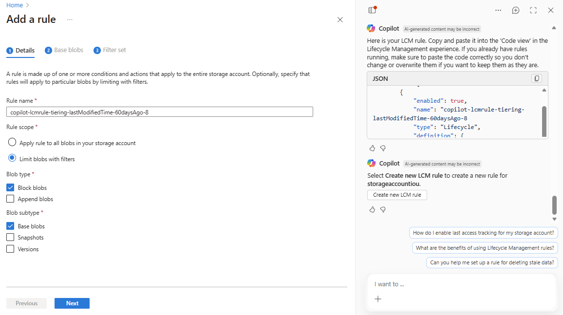 이제 Azure Copilot에 필요한 모든 정보가 있으므로 수명 주기 관리 규칙을 만듭니다. 규칙을 직접 복사하여 붙여넣거나 Azure Copilot에서 규칙을 만들고 적용할 수 있습니다.