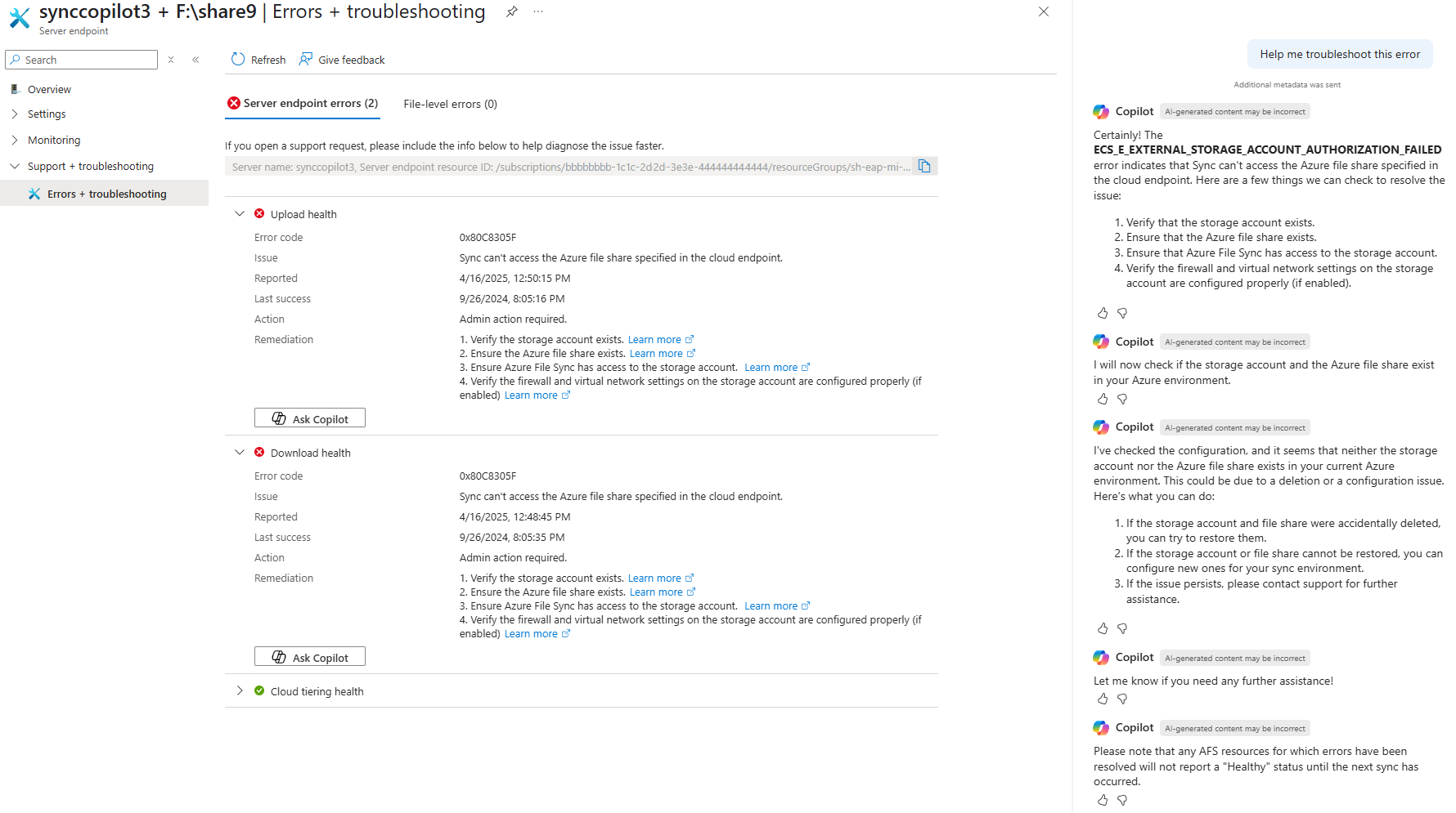 Azure 파일 동기화를 사용하는 경우 Azure Copilot를 사용하면 일반적인 문제를 신속하게 해결하고 해결할 수 있습니다. 환경을 분석하여 네트워크 문제, 잘못된 권한 설정, 또는 누락된 파일 공유와 같은 잠재적 근본 원인을 식별합니다. 그 후 Azure Copilot는 실행 가능한 권장 사항을 제공합니다.