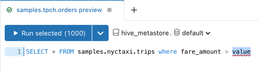 달러 기호 한 개와 중괄호로 정수 탭 순서를 감싸서 삽입 지점을 지정합니다. ${} 콜론 :앞에 오는 텍스트 자리 표시자는 선택 사항이지만 코드 조각에 익숙하지 않은 사용자에게 유용합니다. 이전에 생성한 삽입 지점이 포함된 쿼리 코드 조각에서, ${1:value}은 자리 표시자가 있는 삽입 지점이며, ${1:100}은 런타임 시 재정의할 수 있는 자리 표시자의 기본값이 있는 삽입 지점입니다. Databricks SQL이 코드 조각을 렌더링하면 달러 기호 $ 와 중괄호 {} 가 제거되고 단어 value 또는 기본값 100 이 대체용으로 강조 표시됩니다.