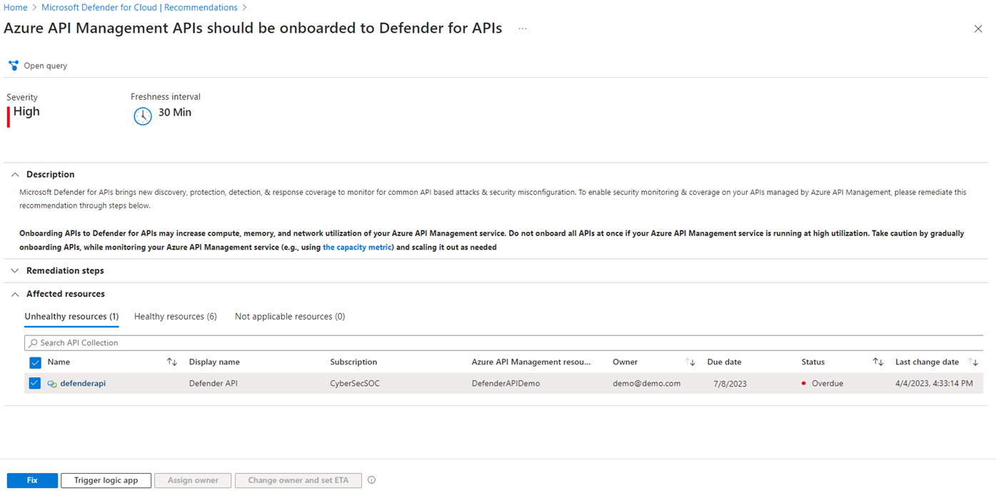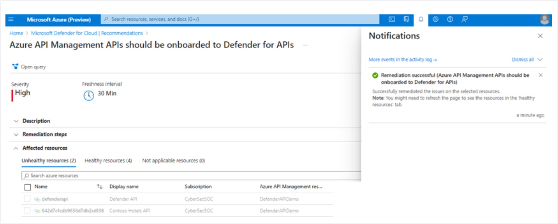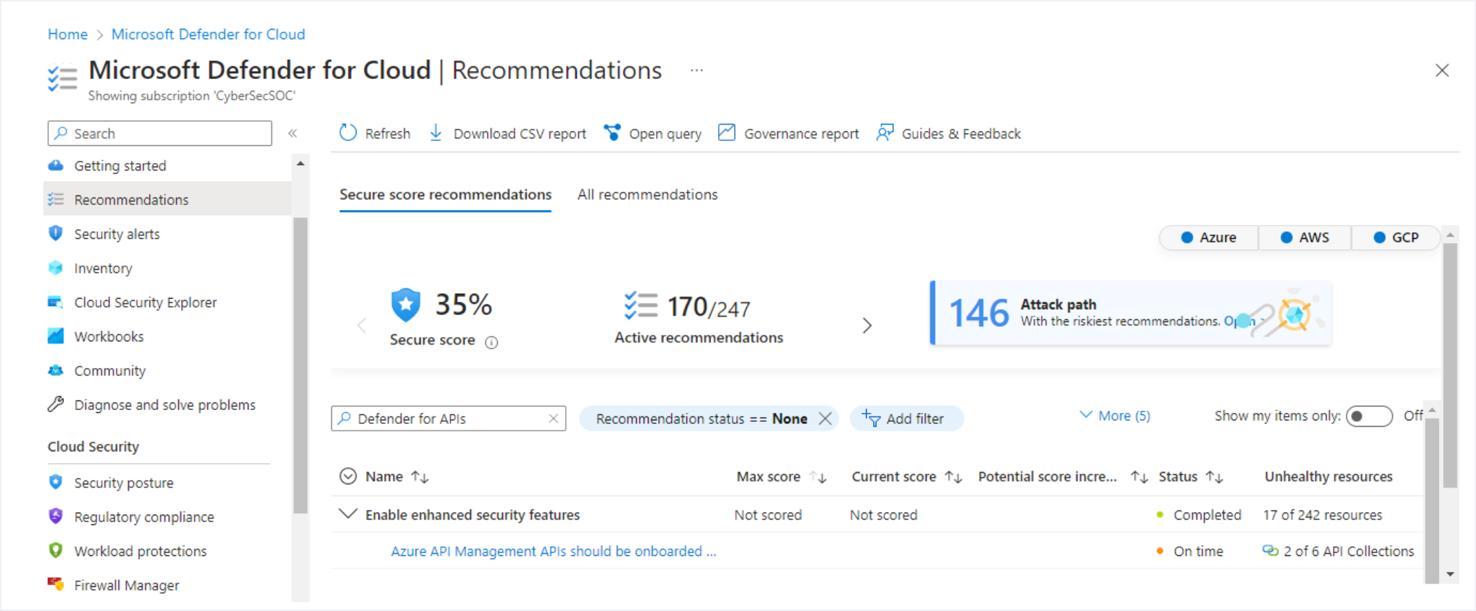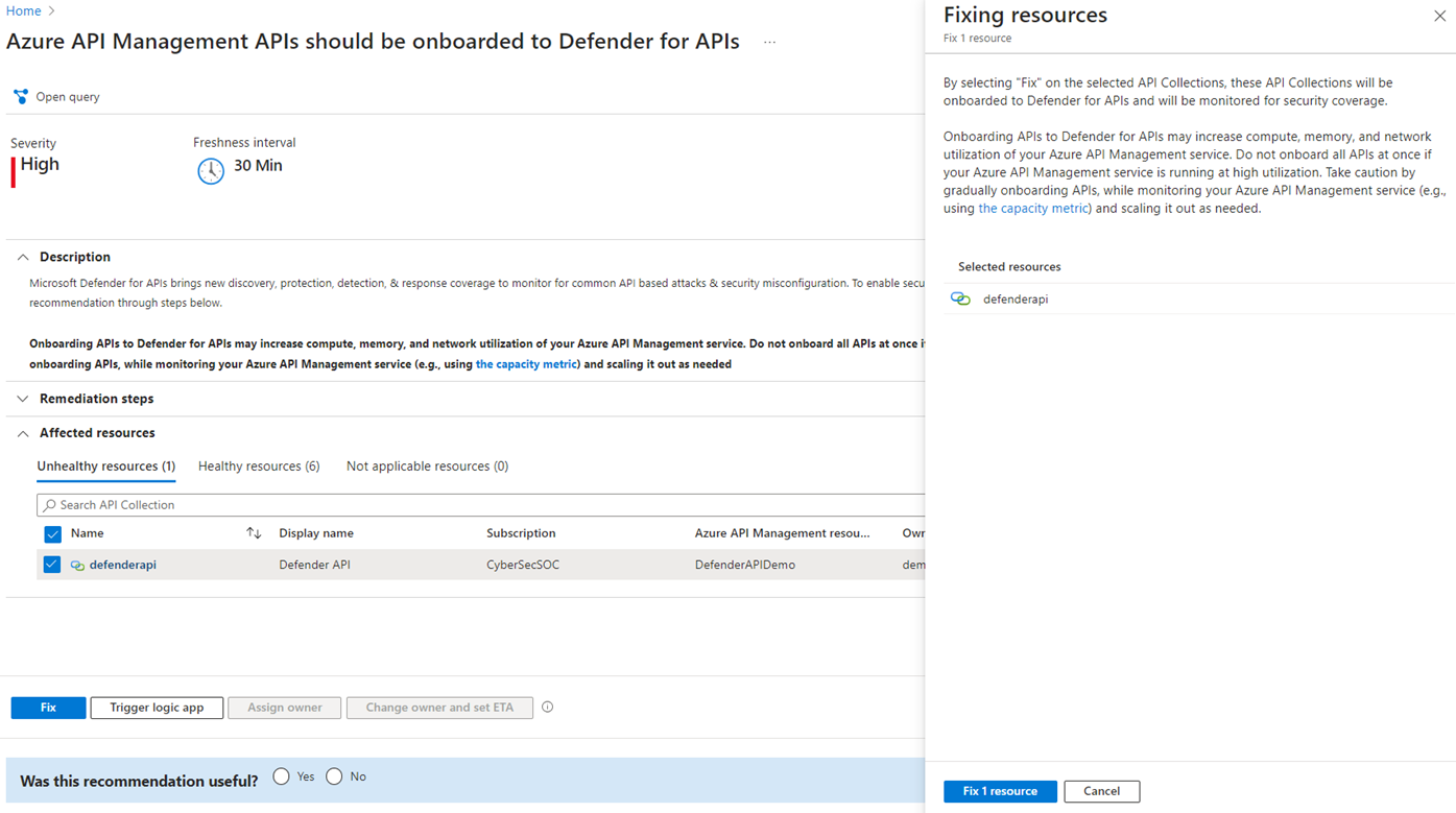 보안 강화 기능 사용에서 Azure API 관리 API를 Defender for API에 온보딩해야 함 보안 권장 사항을 선택합니다.