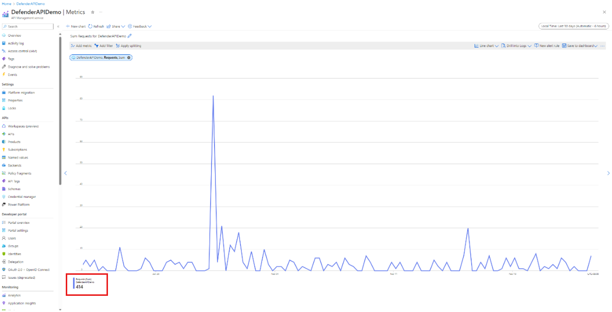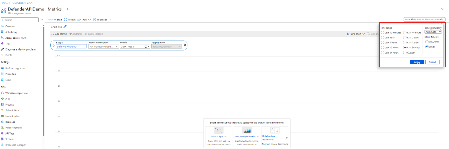 Azure API Management 포털로 이동하여 모니터링 메뉴 모음 항목 아래에서 메트릭을 선택합니다.