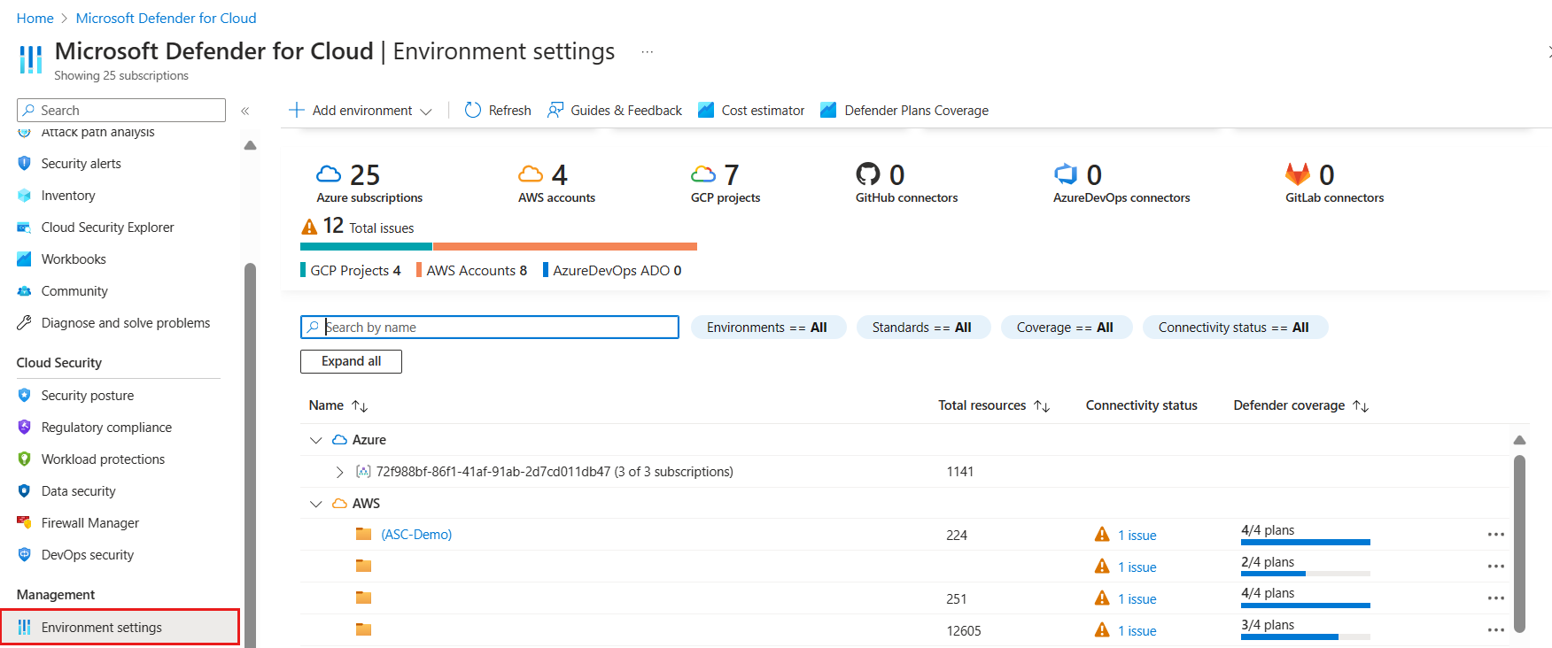 포털에 로그인하고 클라우드용 Defender에서 환경 설정을 선택합니다.