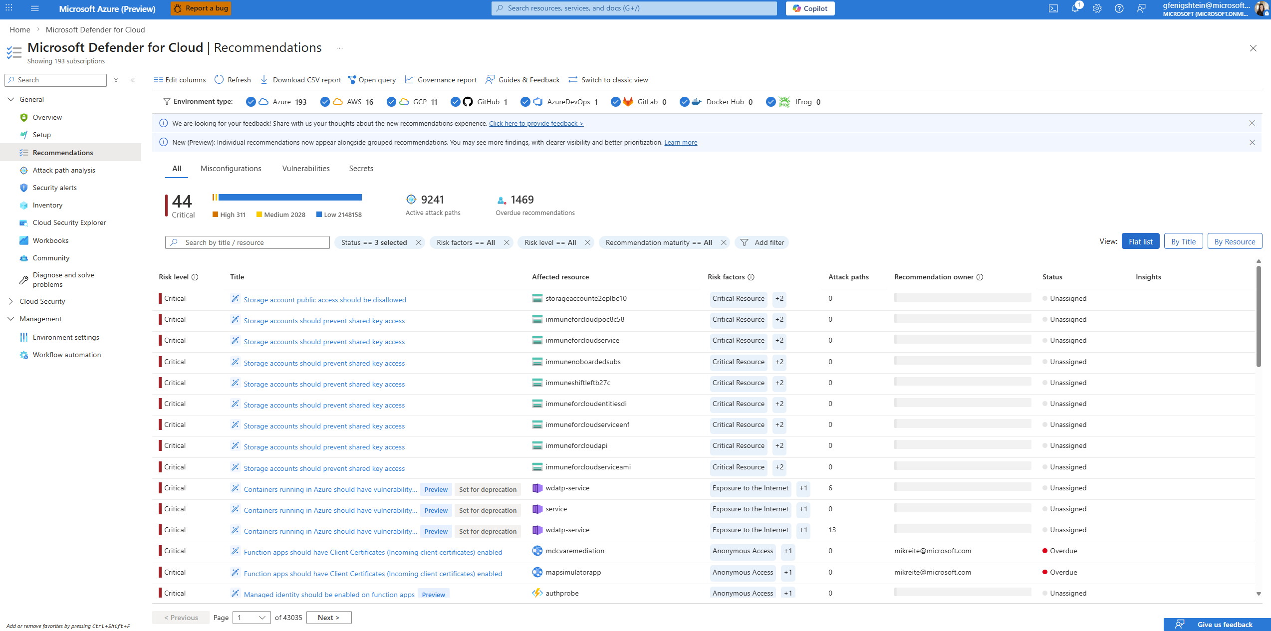권장 사항 결과에서 영향을 받는 리소스, 위험 요소, 공격 경로, 기한 및 상태를 포함한 권장 사항을 검토합니다.