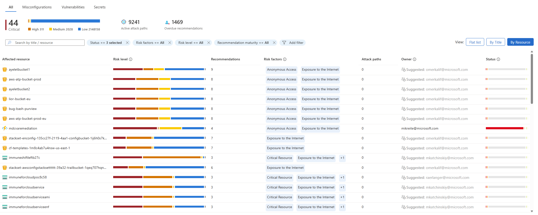 이 보기는 위험 수준별로 정렬된 개별 자산별로 구성된 모든 권장 사항 목록을 표시합니다. 각 행은 특정 리소스에 영향을 주는 단일 권장 사항을 나타냅니다.