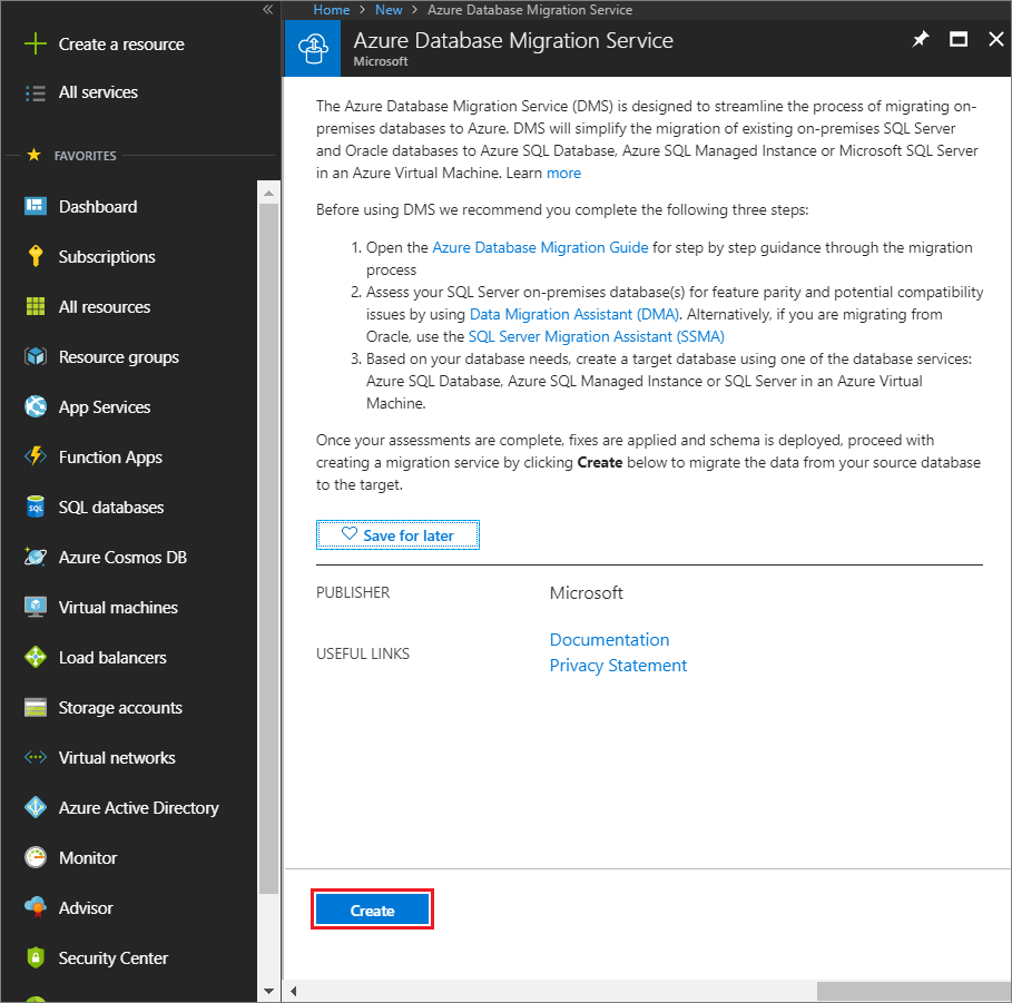 Azure Database Migration Service 화면에서 만들기를 선택합니다.