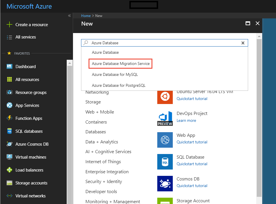 Azure Portal에서 + 리소스 만들기를 선택하고, Azure Database Migration Service를 검색한 다음, 드롭다운 목록에서 Azure Database Migration Service를 선택합니다.