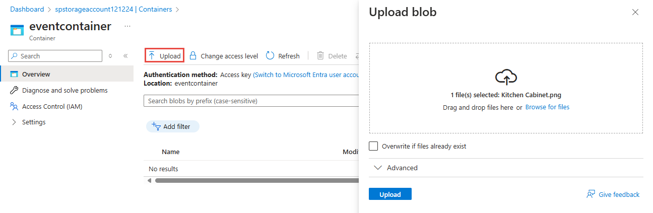 파일을 업로드하여 Blob Storage에 대한 이벤트를 트리거합니다. 파일에는 특정 콘텐츠가 필요하지 않습니다.