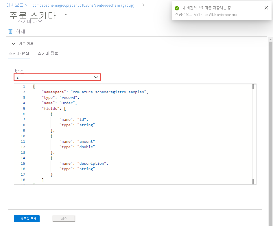 2페이지의 버전에 대해 가 선택된 것을 볼 수 있습니다.스키마의 버전 1을 표시하려면