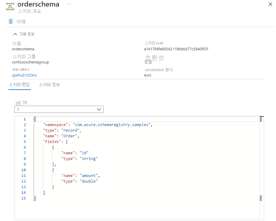 { "namespace": "com.azure.schemaregistry.samples", "type": "record", "name": "Order", "fields": [ { "name": "id", "type": "string" }, { "name": "amount", "type": "double" } ] }만들기를 실행합니다.