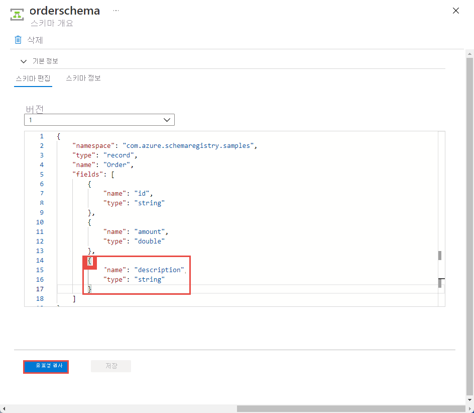 description인 새 필드를 추가합니다.유효성 검사 상태 및 변경 내용을 검토하고 저장을 선택합니다.