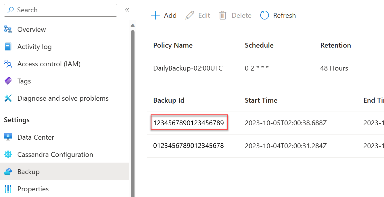 복원하려는 백업에 대해 포털에서 백업 ID를 제공합니다. Azure Portal에서 이 ID를 찾을 수 있습니다.