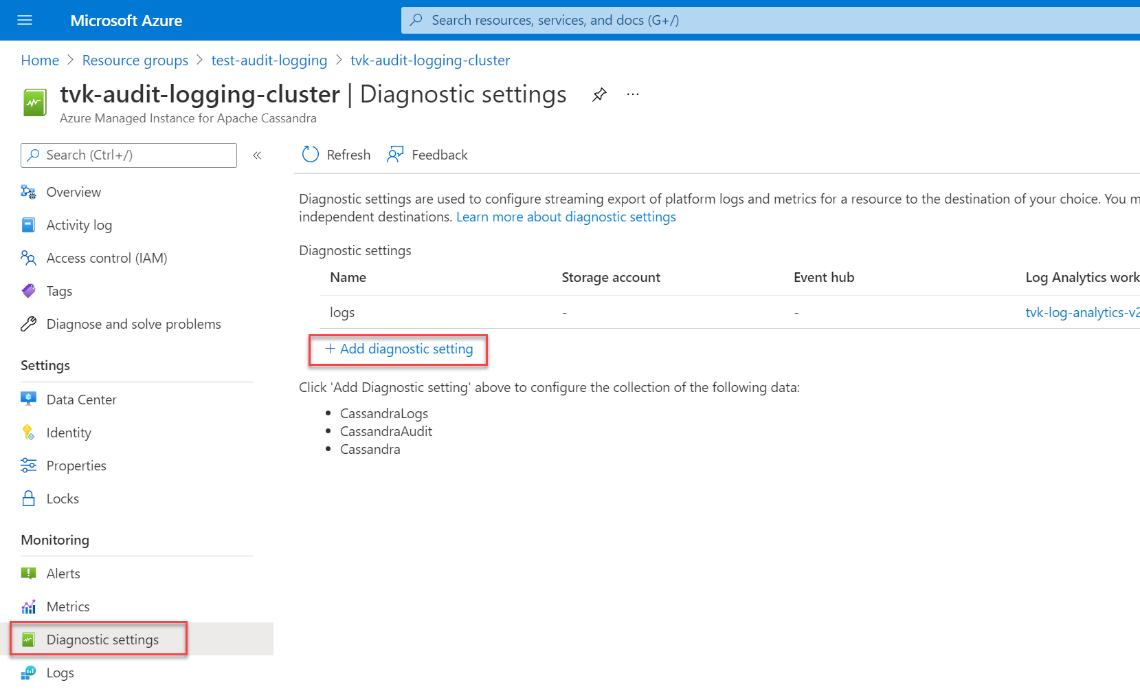 플랫폼 메트릭 및 활동 로그는 자동으로 수집됩니다. 리소스 로그를 수집하거나 Azure Monitor 외부로 전달하려면 진단 설정을 만들어야 합니다. Apache Cassandra 클러스터 리소스용 Azure Managed Instance에 대한 진단 설정을 켜고 리소스 로그를 다음 원본으로 보낼 수 있습니다.