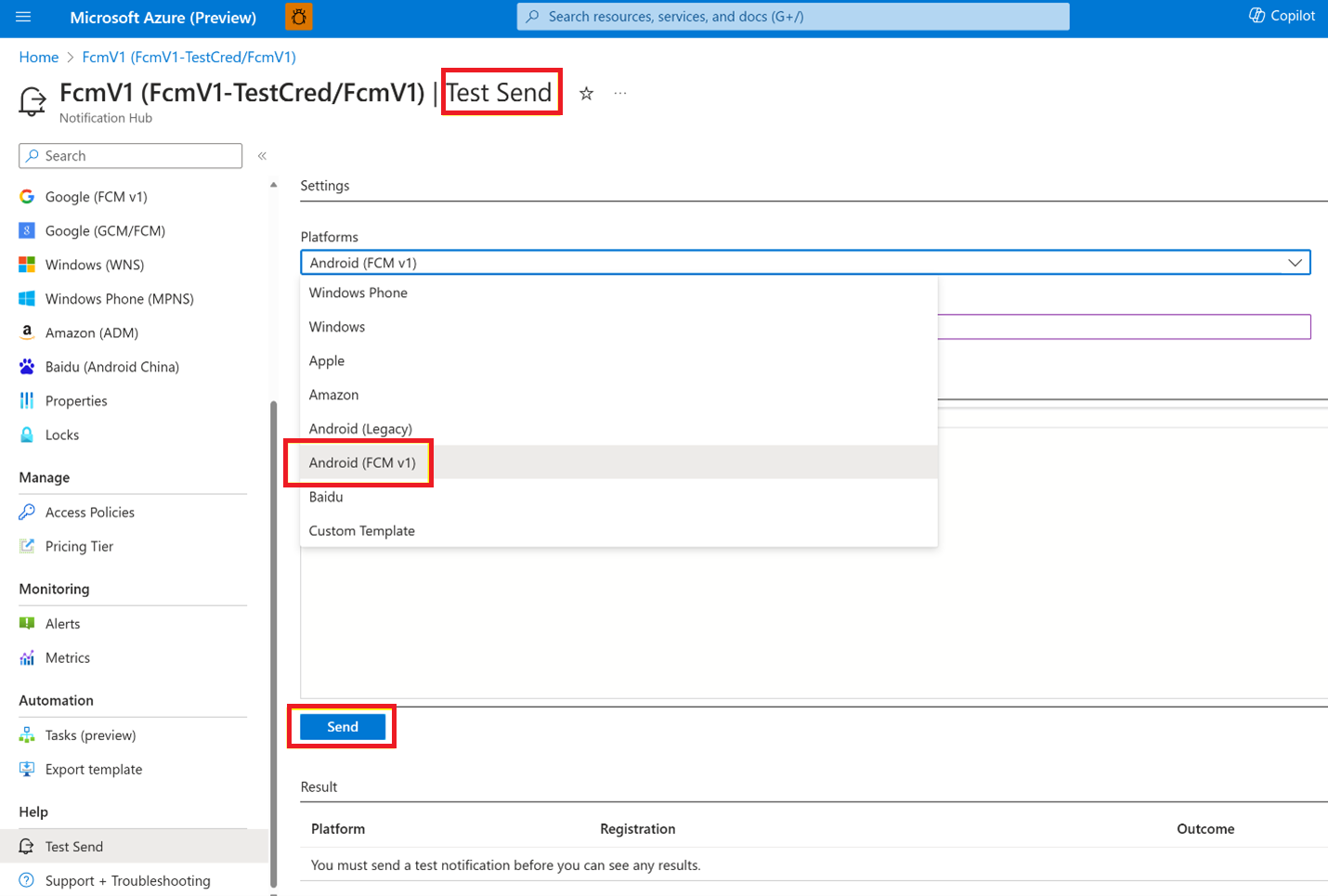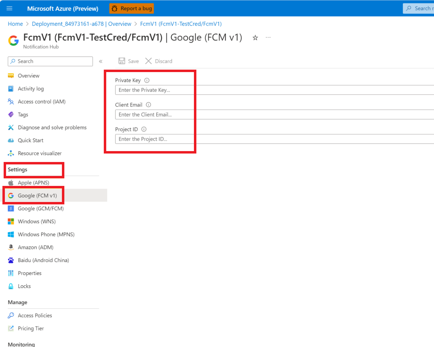 옵션 1: Azure Portal을 통해 FcmV1 자격 증명 업데이트