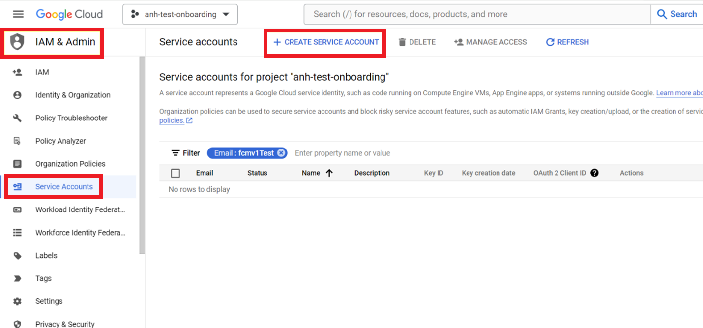 사용자 지정된 액세스 권한이 있는 서비스 계정을 만들려면 IAM 및 관리자 > 서비스 계정 페이지를 통해 서비스 계정을 만들 수 있습니다. 서비스 계정 권한 관리를 클릭하여 해당 페이지로 직접 이동합니다. 다음 역할 중 하나가 있는 서비스 계정을 만들 수 있습니다.