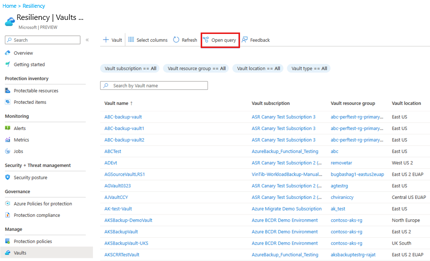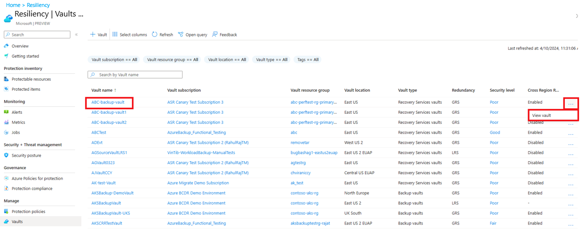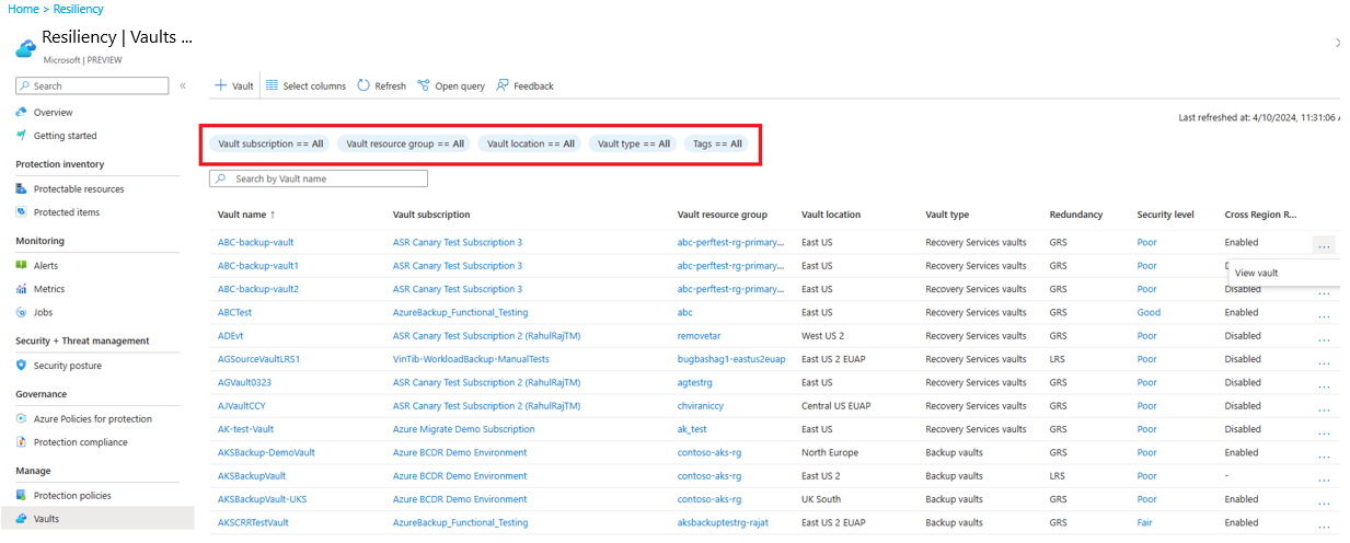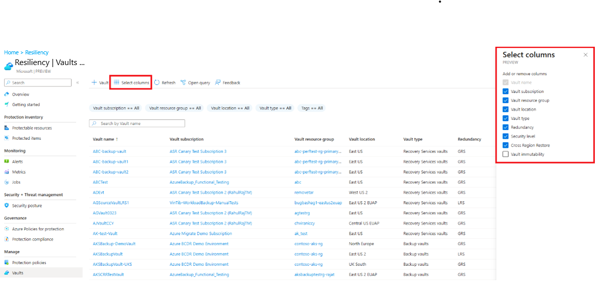 Resiliency 기능을 사용하여 모든 기존 Recovery Services 볼트와 백업 볼트를 한 번에 확인하고 필요에 따라 그들의 수명 주기를 관리할 수 있습니다.