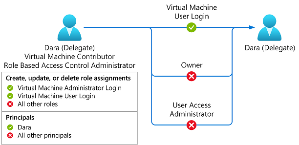 이 조건을 사용하면 대리자는 가상 머신 관리자 로그인 또는 가상 머신 사용자 로그인 역할에 대한 역할 할당만 추가하거나 제거할 수 있습니다. 또한 대리자는 Dara(ea585310-c95c-4a68-af22-49af4363bbb1)라는 특정 사용자에게만 이러한 역할을 할당할 수 있습니다.