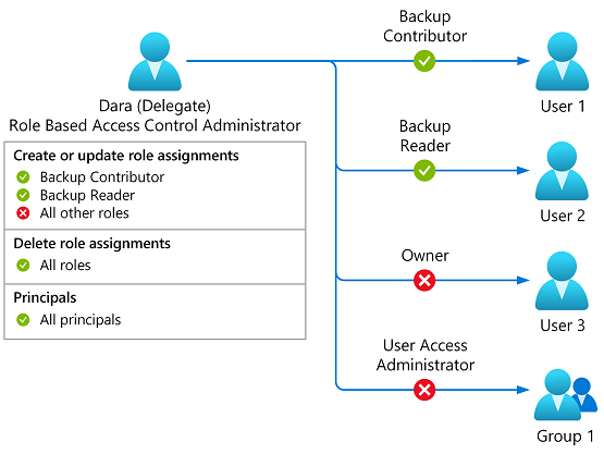 이 조건을 사용하면 대리자는 백업 기여자 또는 백업 읽기 권한자 역할에 대한 역할 할당만 추가하거나 제거할 수 있습니다. 또한 대리자는 이러한 역할을 사용자 또는 그룹 형식의 주체에게만 할당할 수 있습니다.