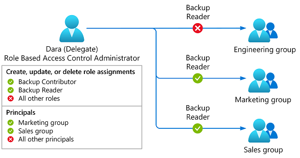 이 조건을 사용하면 대리자는 백업 기여자 또는 백업 읽기 권한자 역할에 대한 역할 할당만 추가하거나 제거할 수 있습니다. 또한 대리자는 마케팅(28c35fea-2099-4cf5-8ad9-473547bc9423) 또는 영업(86951b8b-723a-407b-a74a-1bca3f0c95d0)이라는 특정 그룹에만 이러한 역할을 할당할 수 있습니다.