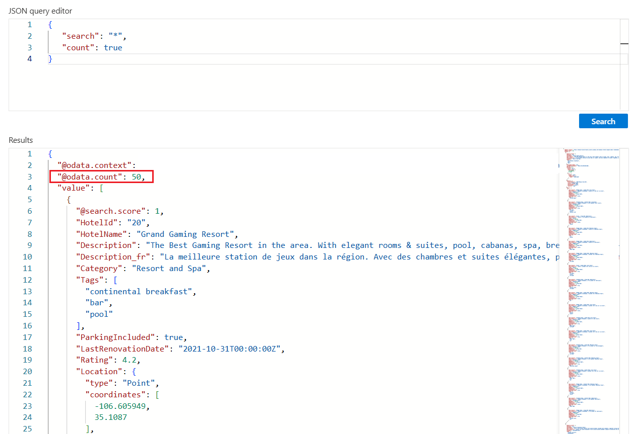 인덱스에서 찾은 일치 항목 수를 가져오려면 "count": true(을)를 추가합니다. 빈 검색에서 개수는 인덱스의 총 문서 수입니다. 정규화된 검색에서는 쿼리 입력과 일치하는 문서의 수입니다. 서비스는 기본적으로 상위 50개 일치 항목을 반환하므로 개수는 결과에 반환된 것보다 인덱스의 일치 항목이 더 많을 수 있습니다.