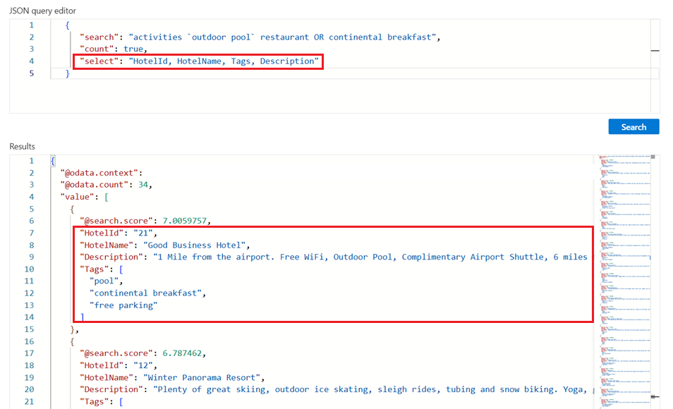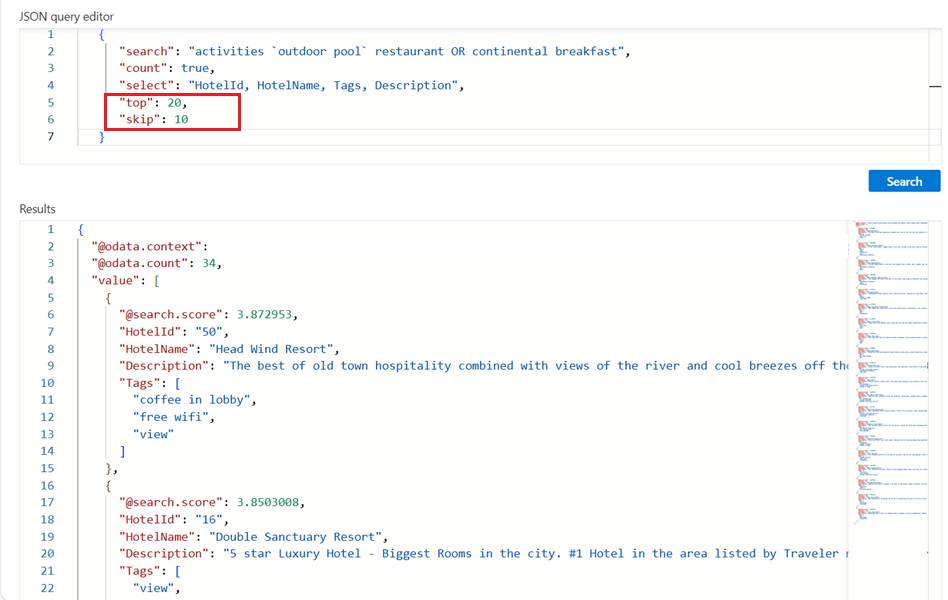 Azure AI Search는 검색 순위에 따라 상위 50개 일치 항목을 반환합니다. 호텔 샘플 목록은 50개의 호텔만 포함하고 있으므로, 더 적은 수의 호텔을 사용하여 페이지 기능을 보여 줍니다. 일치하는 다음 문서 "top": 20"skip": 10 집합을 가져와서 결과 집합을 20개 문서(기본값: 50, 최대값 1000)로 늘리려면 처음 10개의 문서를 건너뜁니다. 문서 키(HotelId)를 확인하여 문서를 식별할 수 있습니다.