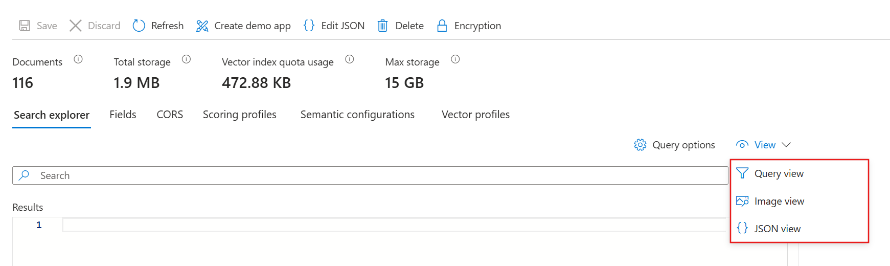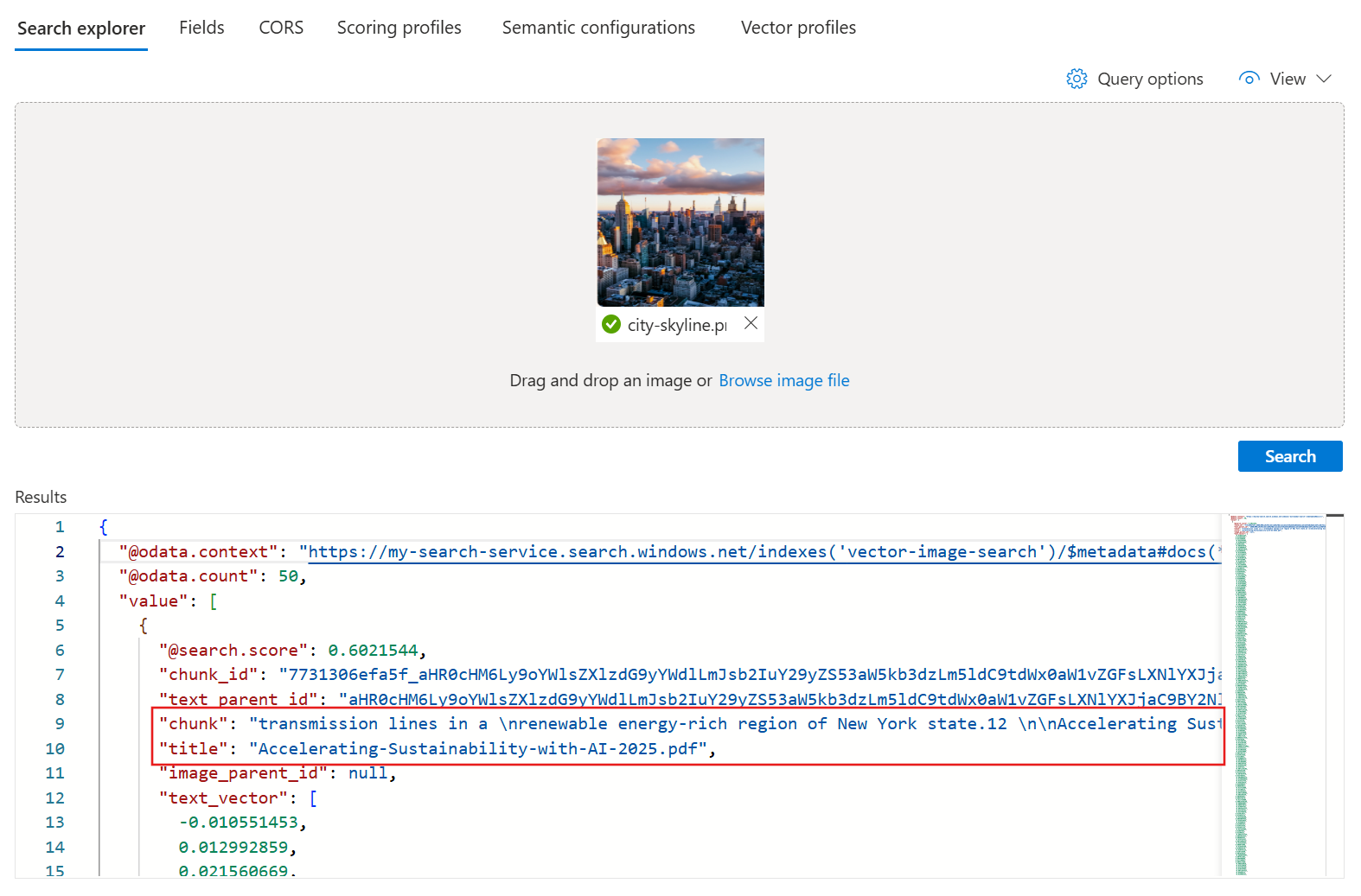 검색 탐색기는 이미지 보기를 통해 이미지를 쿼리 입력으로 허용하므로 지원되는 벡터라이저 기술 쌍을 사용해야 합니다. 자세한 내용은 검색 인덱스에서 벡터라이저 구성을 참조하세요.