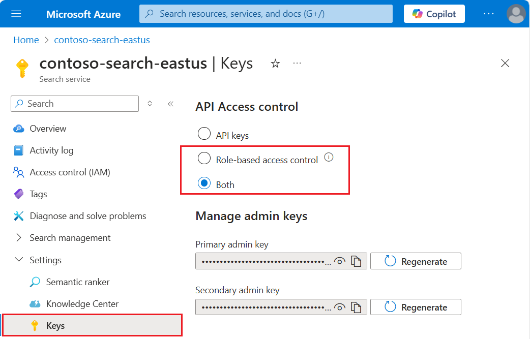 검색 서비스를 만들 때 키 기반 인증이 기본값이지만 가장 안전한 옵션은 아닙니다. 이 문서에 설명된 대로 역할 기반 액세스로 바꾸는 것이 좋습니다.