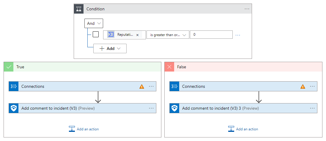 다음 작업은 IP 주소 보고서의 결과에 따라 각 루프의 나머지 작업을 결정하는 조건 입니다. 보고서의 IP 주소에 지정된 평판 점수를 분석합니다. 0보다 높은 점수는 주소가 무해하다는 것을 나타냅니다. 점수가 0보다 낮으면 악의적임을 나타냅니다.