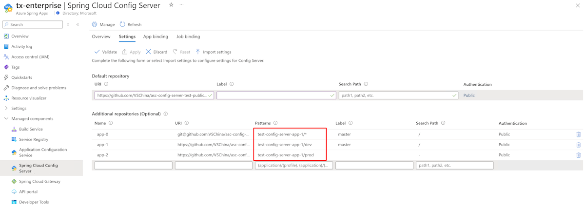 패턴과 리포지토리 URI는 프로필로 명명된 test-config-server-app-0 Spring 부팅 애플리케이션과 일치합니다. |