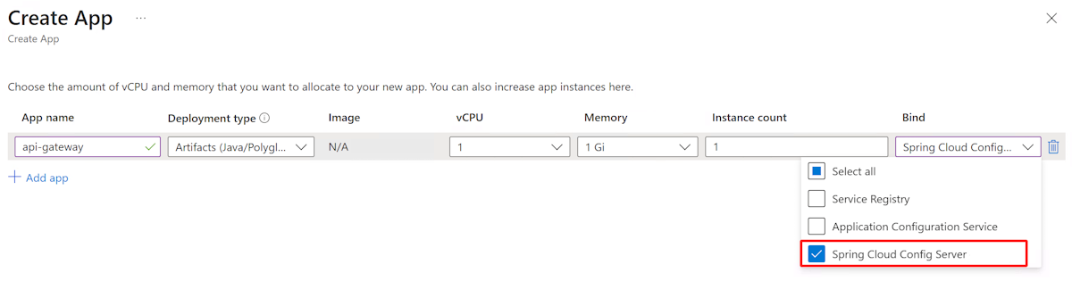 다음 스크린샷에 표시된 것처럼 Azure Portal에서 Spring Cloud Config Server에 애플리케이션을 바인딩할 수도 있습니다.