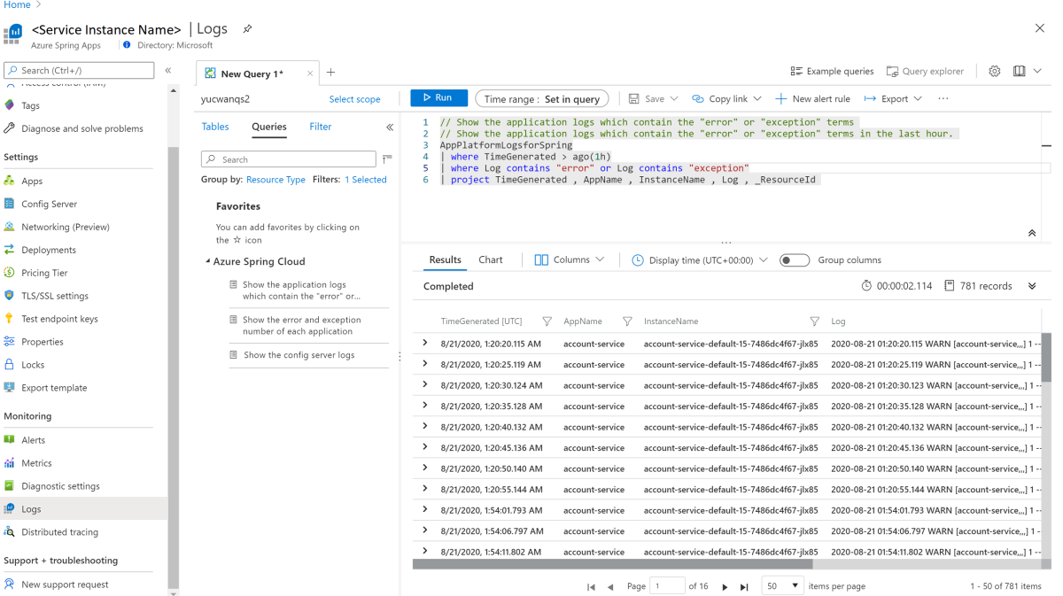 Azure Portal에서 서비스 | 개요 페이지로 이동하여 모니터링 섹션에서 로그를 선택합니다. Azure Spring Apps에 대한 샘플 쿼리 중 하나에서 실행을 선택합니다.
