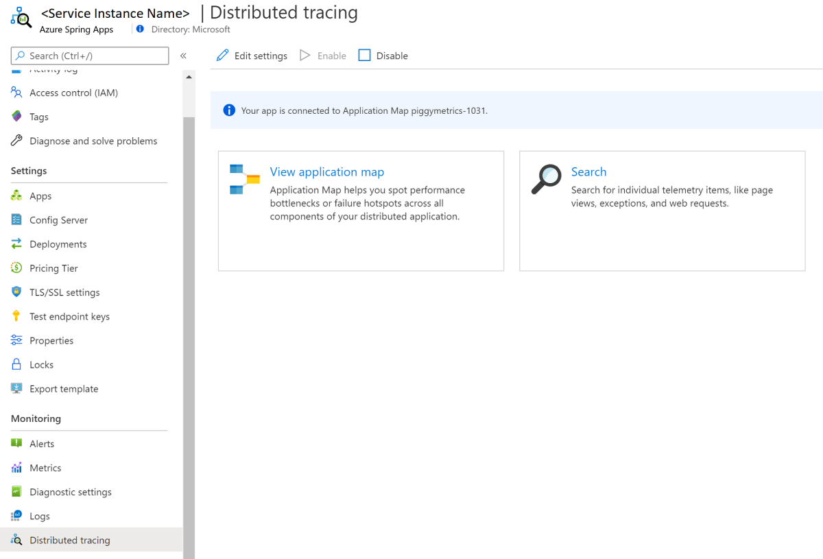Azure Spring Apps의 기본 제공 모니터링 기능을 사용하여 복잡한 문제를 디버그하고 모니터링할 수 있습니다. Azure Spring Apps는 Steeltoe 분산 추적을 Azure의 Application Insights와 통합합니다. 이 통합은 Azure Portal에서 강력한 로그, 메트릭 및 분산 추적 기능을 제공합니다.