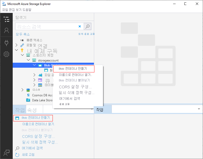 컨테이너는 디렉터리와 파일을 보관합니다. 계정을 만들려면 진행 단계에서 만든 스토리지 계정을 확장합니다. Blob 컨테이너를 선택하고 마우스 오른쪽 단추로 클릭하여 Blob 컨테이너 만들기를 선택합니다. 또는 Blob 컨테이너를 선택한 다음 작업 창에서 Blob 컨테이너 만들기를 선택할 수 있습니다.