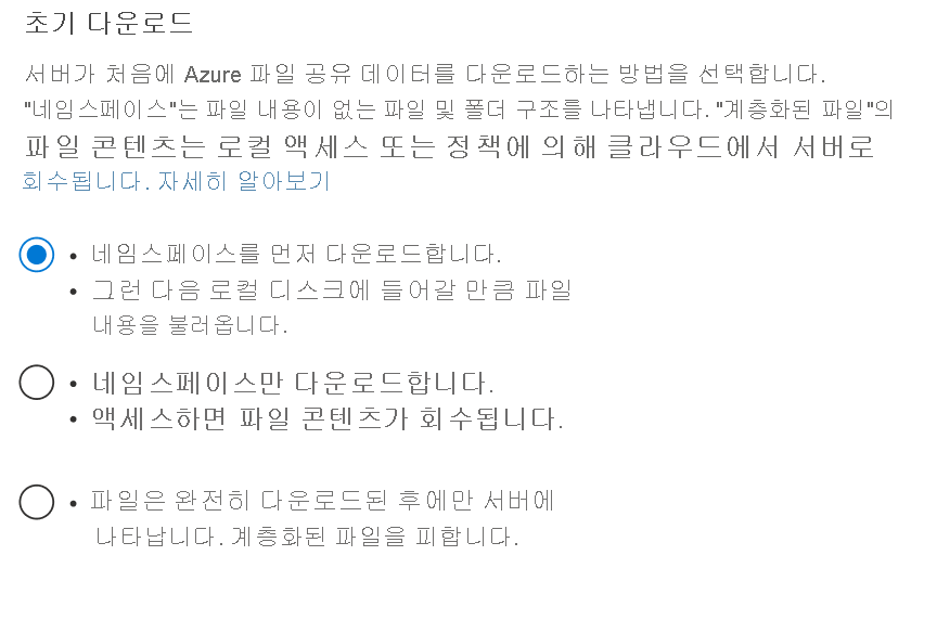 | 설명 | 먼저 전체 네임스페이스를 다운로드합니다. 파일 콘텐츠는 열 지도를 기준으로 백그라운드 활동으로서 클라우드에서 서버로 회수되며, 최근 액세스한 데이터를 더 빨리 회수합니다. 서버 볼륨의 여유 공간이 10% 미만인 경우 나머지 파일은 계층화된 파일로 남아 있습니다. | 네임스페이스(파일 및 폴더 구조)만 다운로드됩니다. 서버로 파일 콘텐츠가 가져오지 않습니다. | 서버의 폴더에 파일이 표시되기 전에 각 파일을 전체적으로 다운로드합니다. 이 옵션은 계층화된 파일이 서버에 존재하는 것을 방지합니다. 네임스페이스 항목과 파일 콘텐츠는 항상 동시에 표시됩니다. |