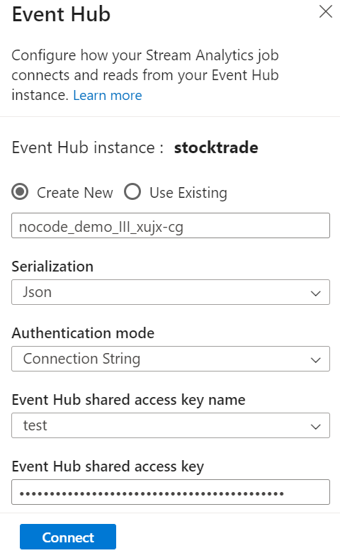 Event Hubs 창에서 데이터의 Serialization 형식 및 작업이 Event Hubs에 연결하는 데 사용할 인증 방법을 지정합니다. 그런 다음 연결을 선택합니다.
