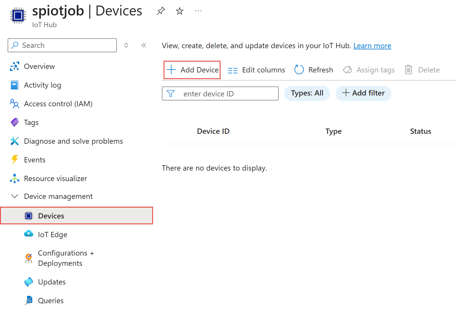 디바이스를 만든 후 IoT 디바이스 목록에 디바이스 가 표시됩니다. 표시되지 않으면 페이지에서 새로 고침 단추를 선택합니다.