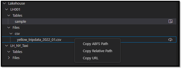 코드에서 테이블, 폴더 또는 파일을 더 쉽게 참조할 수 있도록 관련 경로를 복사할 수 있습니다. 대상 노드를 마우스 오른쪽 단추로 클릭하고 ABFS 경로 복사, 상대 경로 복사 또는 URL 복사 옵션을 찾습니다.