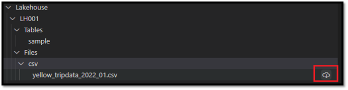 파일 노드를 확장하여 Lakehouse에 저장된 폴더 및 파일을 찾습니다. 파일 이름 오른쪽에 있는 다운로드 옵션을 선택하여 해당 파일을 다운로드합니다.