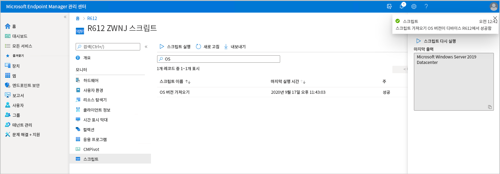 Configuration Manager 온-프레미스 스크립트 실행 기능의 기능을 Microsoft Intune 관리 센터로 가져옵니다. 기술 지원팀 같은 추가 가상 사용자가 개별 Configuration Manager 관리형 디바이스에 대해 실시간으로 클라우드에서 PowerShell 스크립트를 실행할 수 있도록 허용합니다. 이는 Configuration Manager 관리자가 이미 정의하고 승인한 PowerShell 스크립트의 모든 기존 이점을 이 새로운 환경에 제공합니다.