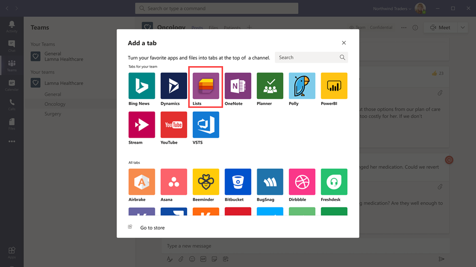 Teams에서 사용자는 채널의 탭에서 Lists에 액세스할 수 있습니다. 탭 + 갤러리를 열고 새 Lists 앱 탭 instance 채널에 추가하여 시작합니다.