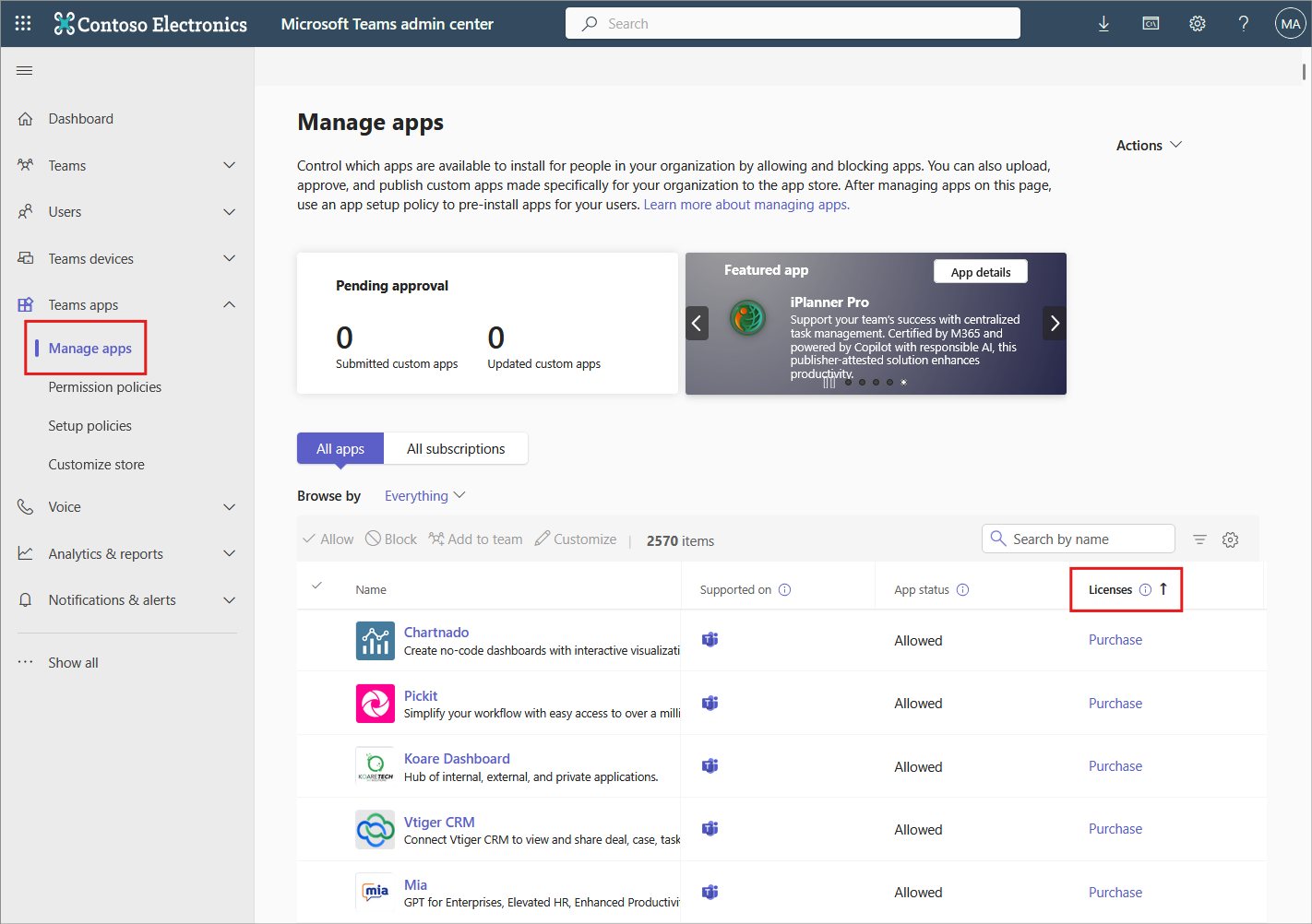 Teams 관리 센터의 앱 관리 페이지에서 타사 앱에서 제공하는 서비스에 대한 라이선스를 구입할 수 있습니다. 테이블 의 라이선스 열은 앱이 구매를 위해 SaaS 구독을 제공하는지 나타냅니다. 신용 카드, 직불 카드 또는 청구서 청구를 사용하여 앱을 구입할 수 있습니다.