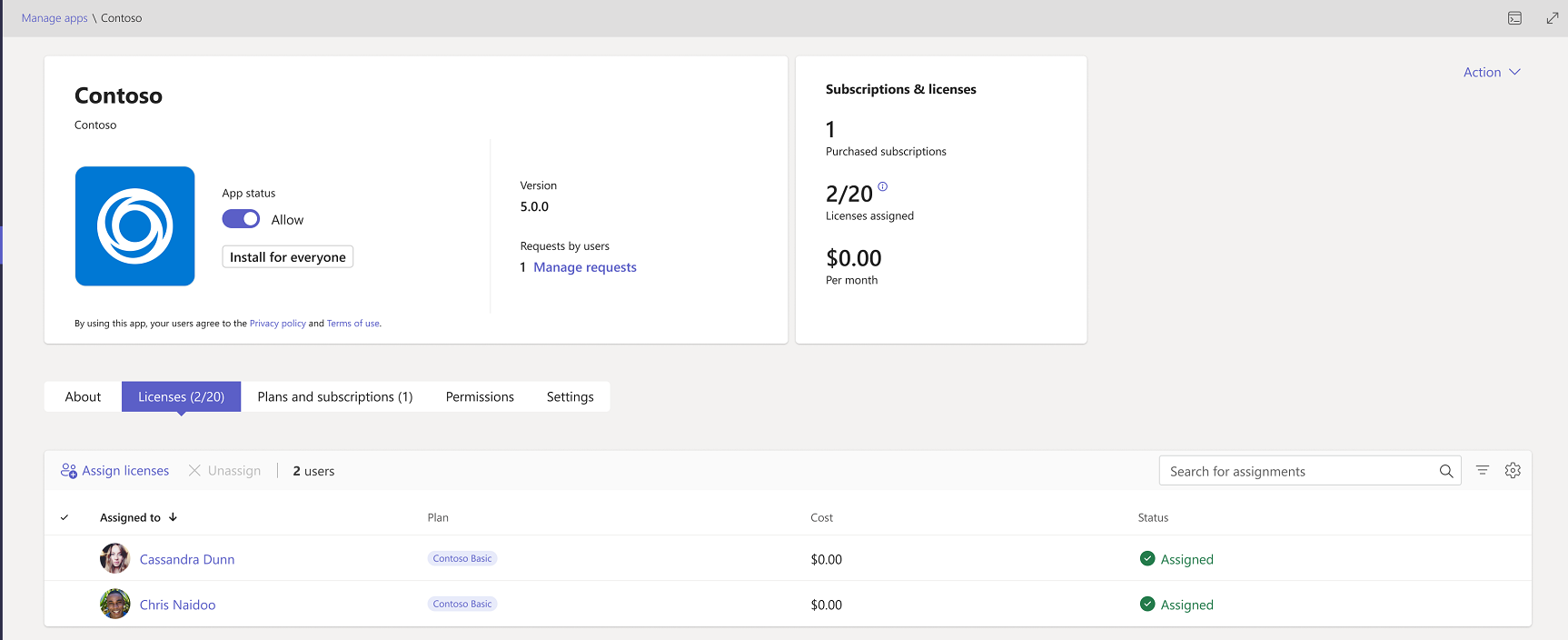 테넌트에서 하나 이상의 사용자에게 라이선스를 할당할 수 있습니다. 앱에 대한 라이선스를 보고 할당하려면 다음을 수행합니다.