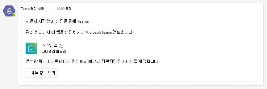 앱 제출 규칙을 설정한 후에는 지정된 채널의 알림 카드를 검토하여 앱 세부 정보를 확인하고 세부 정보 보기를 선택하여 Teams 관리 센터에서 앱을 열 수 있습니다.