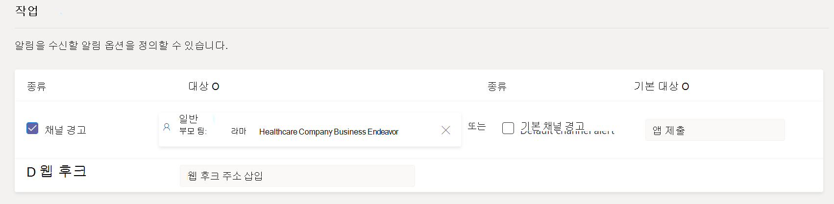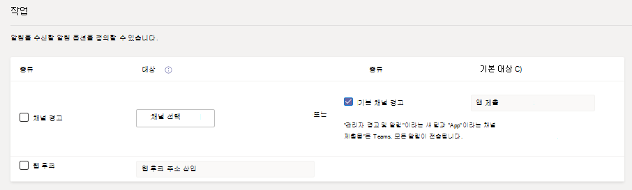 앱 제출 채널의 관리자 경고 및 알림 팀에 알림을 받으려면 기본 채널 경고 확인란을 선택합니다.