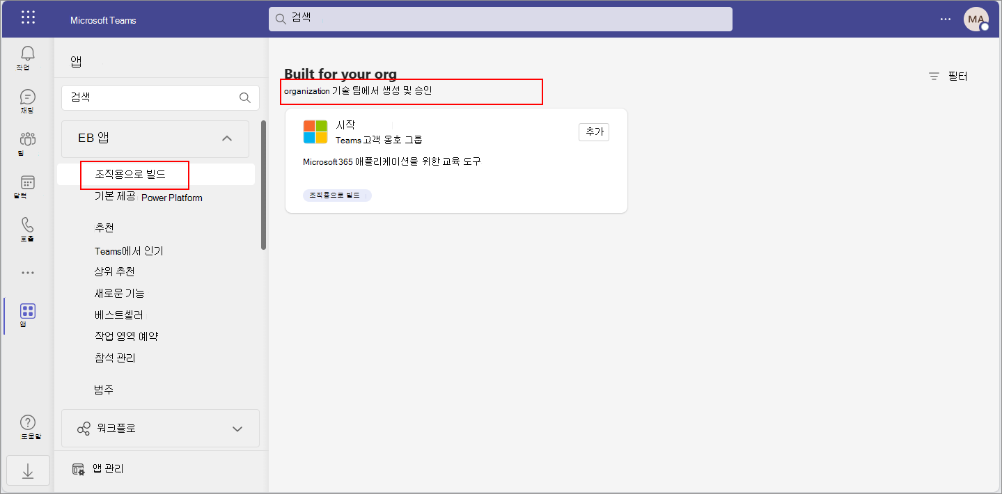 앱에 대한 권한이 있는 사용자는 조직의 앱 스토어에서 앱을 찾을 수 있습니다. Teams 클라이언트의 앱 페이지에서 이러한 앱은 조직용으로 빌드 됨 섹션에서 사용할 수 있습니다.