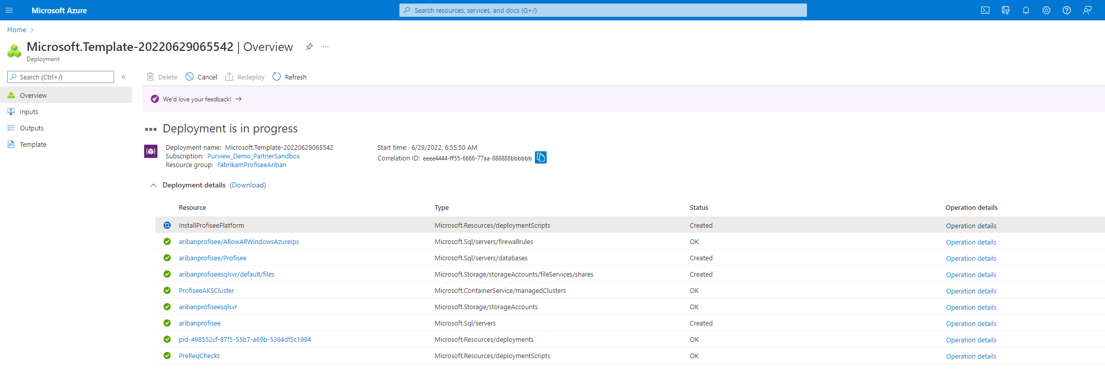 배포가 Profisee 설치를 완료하는 데 약 45-50분이 걸립니다. 배포하는 동안 진행 중인 측면이 표시되고 페이지를 새로 고쳐 진행 상황을 검토할 수 있습니다. 모든 작업이 완료되면 배포가 완료된 것으로 표시됩니다. "InstallProfiseePlatform" 단계가 완료되면 배포가 완료되었음을 나타냅니다.
