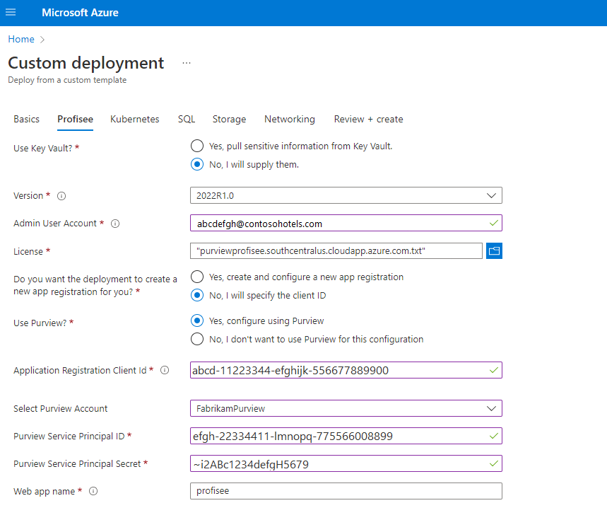 Profisee 구성의 경우 정보를 Key Vault 저장하거나 배포 중에 세부 정보를 제공할 수 있습니다.