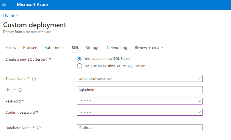 SQL 구성 페이지에서 새 Azure SQL 서버를 배포하거나 기존 Azure SQL 서버를 사용하도록 선택할 수 있습니다. 이 배포에 사용할 로그인 세부 정보 및 데이터베이스 이름을 제공합니다.
