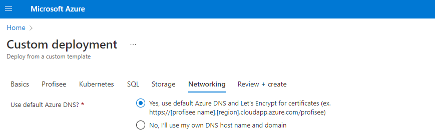 예, 기본 Azure DNS를 사용하는 것이 좋습니다. 예를 선택하면 배포자가 HTTP/TLS용 Let's Encrypt 인증서를 자동으로 만듭니다. 아니요를 선택하는 경우 다양한 네트워킹 구성 매개 변수와 고유한 HTTPS/TLS 인증서를 제공해야 합니다.