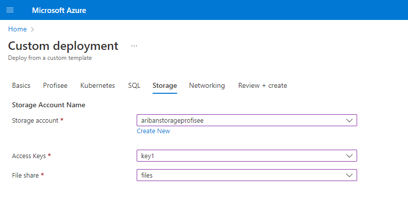 스토리지 구성 페이지에서 새 스토리지 계정을 만들거나 기존 스토리지 계정을 사용하도록 선택할 수 있습니다. 기존 계정을 선택하는 경우 액세스 키와 기존 파일 공유의 이름을 제공해야 합니다.