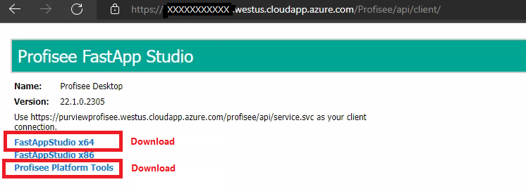 FastApp을 설치하여 새로 설치된 Profisee 환경에 데이터를 채우고 수화합니다. Profisee 배포 URL로 이동하여 /Profisee/api/client를 선택합니다. "https://[profisee_name]와 같이 표시됩니다. [region].cloudapp.azure.com/profisee/api/client". "Profisee FastApp Studio" 유틸리티에 대한 다운로드 및 "Profisee Platform Tools"를 선택합니다. 로컬 클라이언트 컴퓨터에 이러한 도구를 모두 설치합니다.
